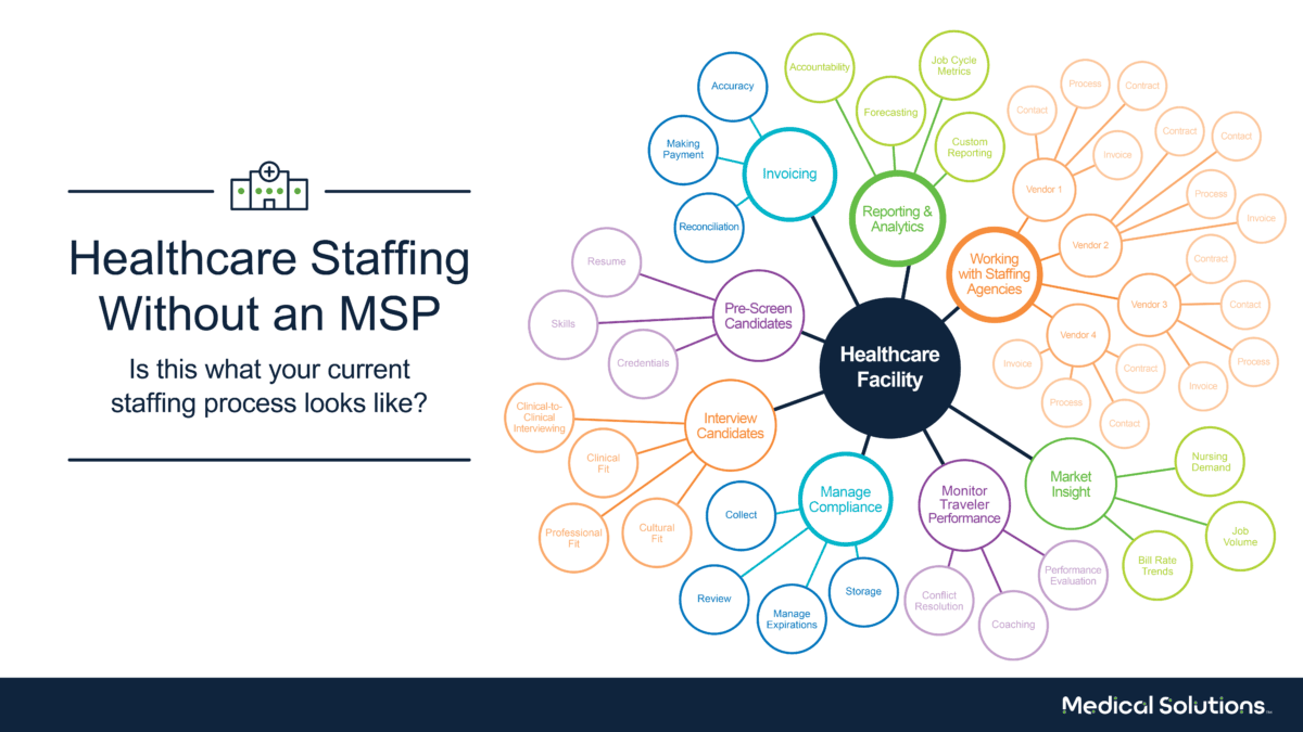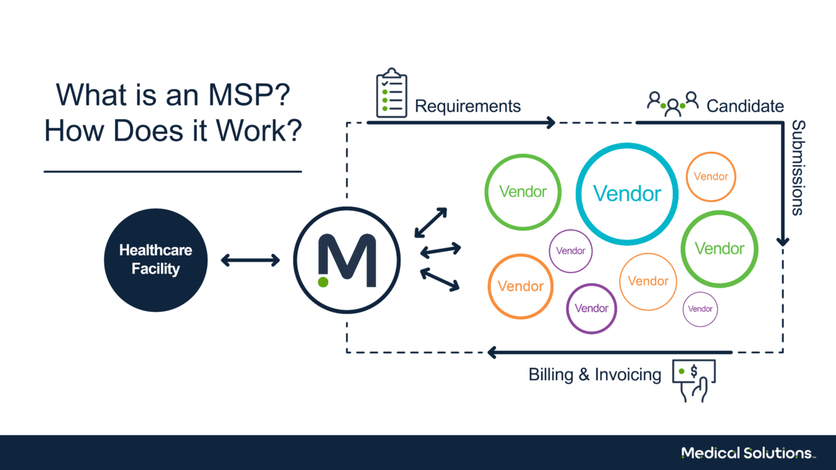 As a healthcare staffing leader or hiring manager, you may be familiar with what a Managed Services Provider (MSP) does or know how an MSP works. Or, you may not know how it differs from more traditional contingent healthcare staffing. If you don’t know or need more details, don’t be embarrassed. At Medical Solutions, it’s a question we hear more than you might suspect. Here’s an MSP described in clear terms and illustrations.
